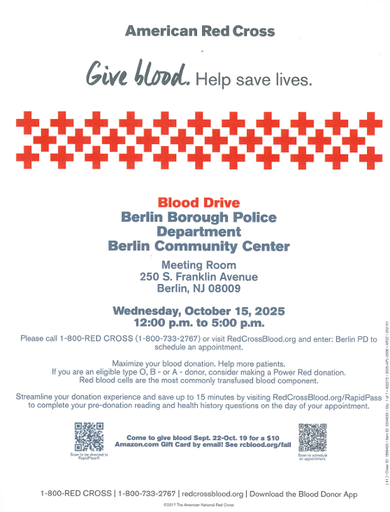American Red Cross Blood Drive Berlin Borough Police Department Berlin Community Center 250 S. Franklin Avenue Berlin, NJ 08009 Please call 1-800-RED CROSS (733-2767) or visit RedCrossBlood.org and enter: Berlin PD to schedule an appointment. More details listed on the flyer or Download PDF.