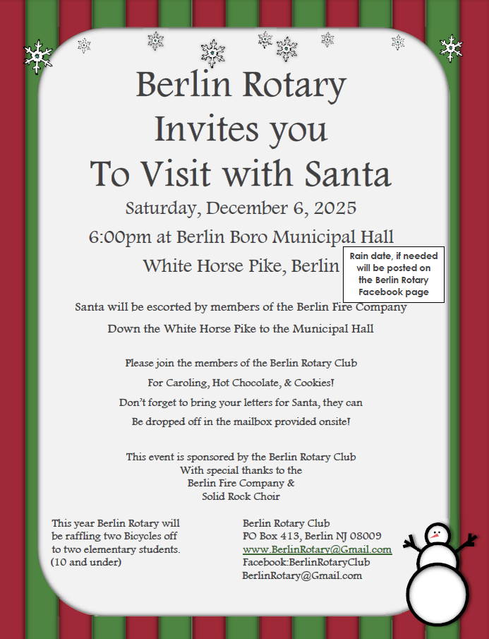 Berlin Rotary Invites you To Visit with Santa! Santa will be escorted by members of the Berlin Fire Company Down the White Horse Pike to the Municipal Hall. Please join the members of the Berlin Rotary Club For Caroling, Hot Chocolate, & Cookies! Don’t forget to bring your letters for Santa, they can be dropped […]